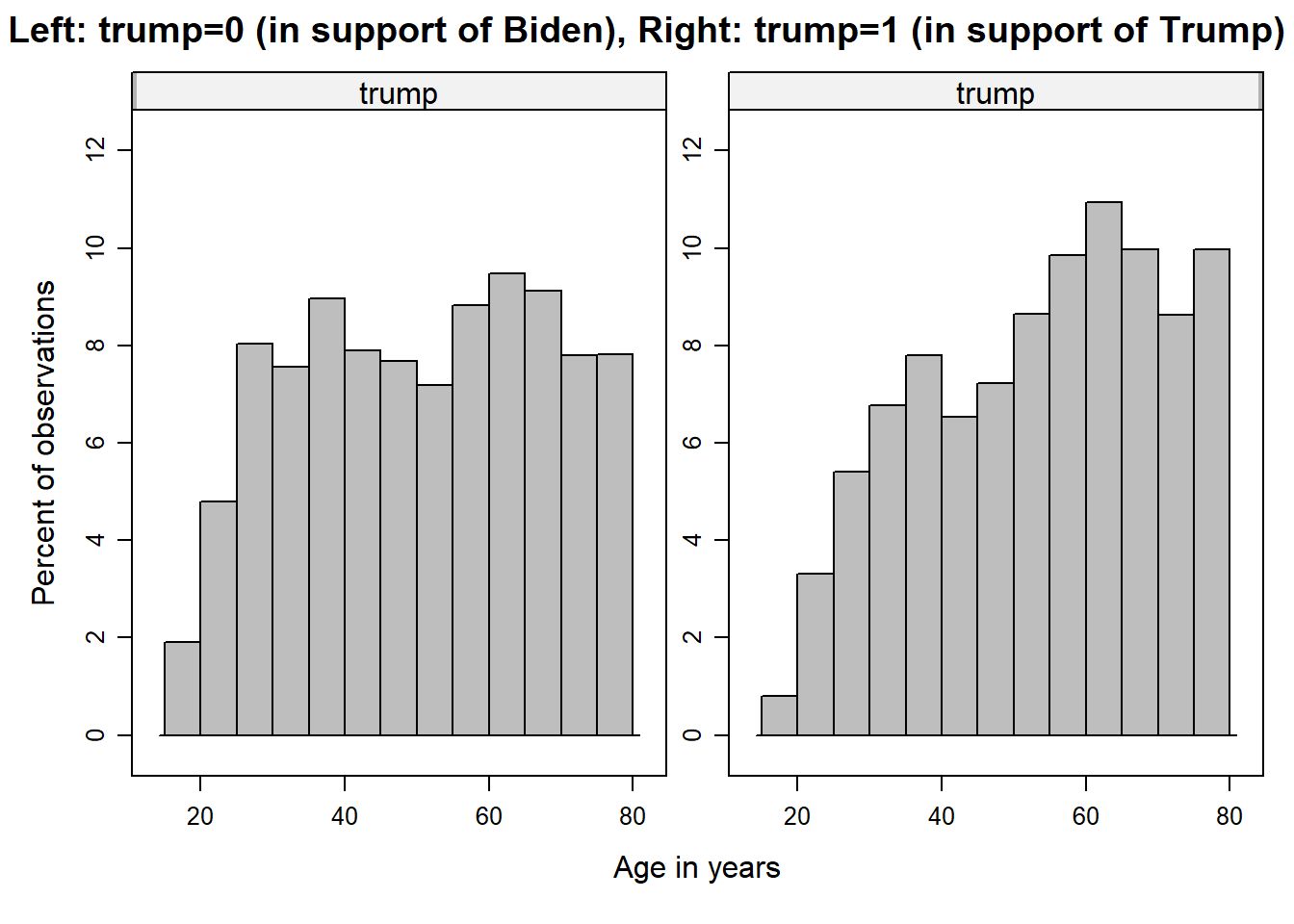 trump = numerical recode of the vote variable. 1=“trump”, 0=“biden”, NA=“other / refused / don’t know”.