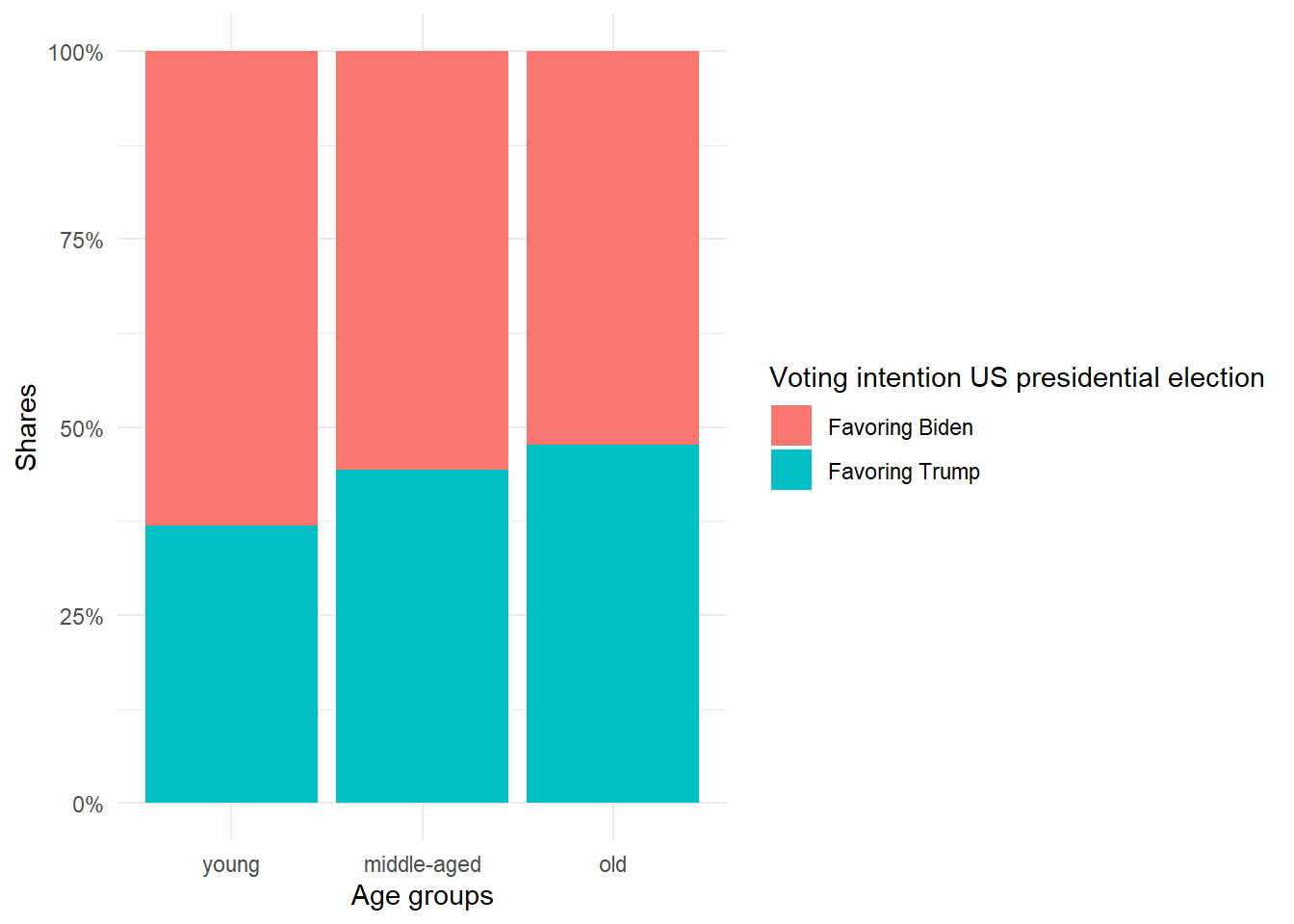 We can see that 3,016 respondents chose Trump, whereas 3,759 opted for Biden. A difference of a couple of hundred responses. For a variable with only a few categories, looking at absolute numbers of observations might be informative. However, using relative frequencies in terms of proportions is typically more informative. Let’s get to it!