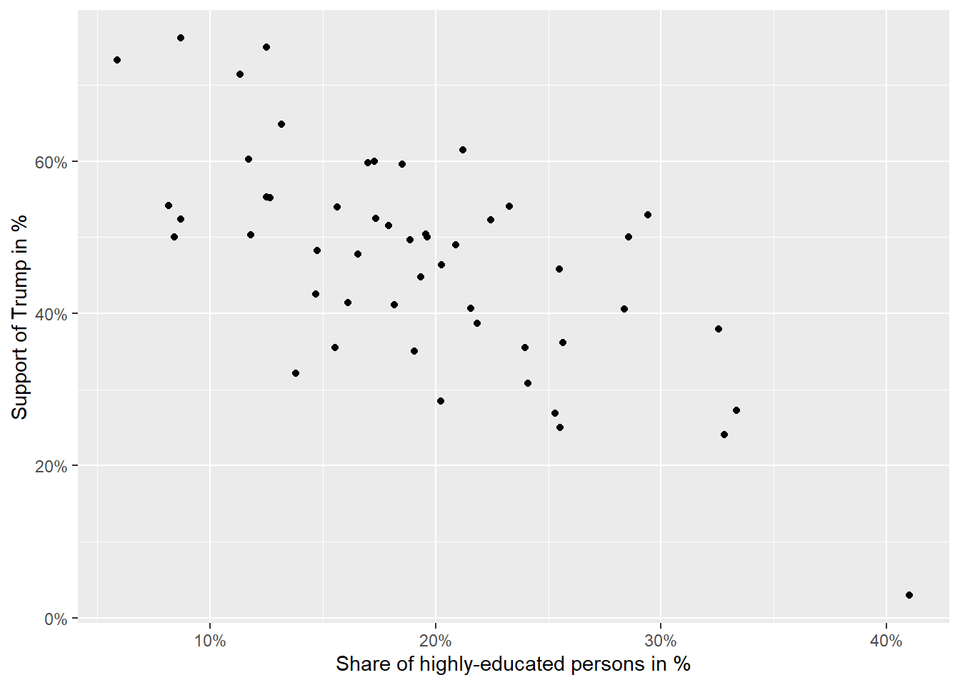 The pattern indicates a negative relationship between the two variables. If the proportion of highly educated people in a region increases (moving to the right on the x-axis), we see that this is related to lower support for Trump (lower scores on the y-axis).