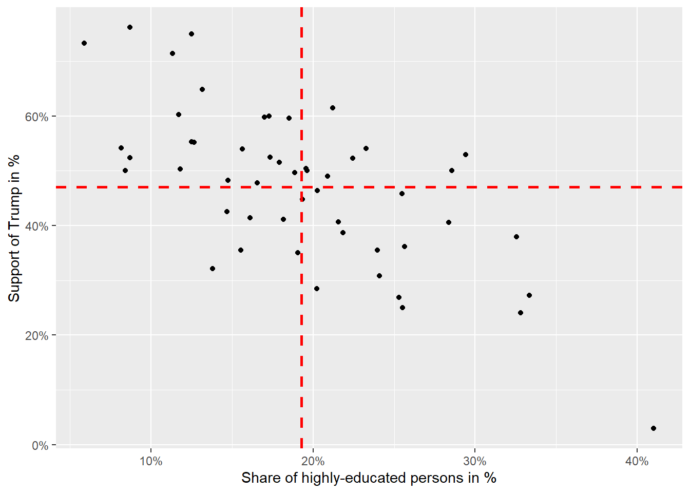 In the next step, we will take a graphical approach to how a correlation is determined. For this, we plot a vertical and a horizontal line that represents the mean of the variables through the cloud of observations represented by the black dots. We see that the dots are mainly in the upper-left quadrant (= low proportion of high education AND high Trump approval) and the lower-right quadrant (= high proportion of high education AND low Trumo approval). This indicates that higher average education tends to be associated with lower average Trump approval. In other words: The correlation is negative.