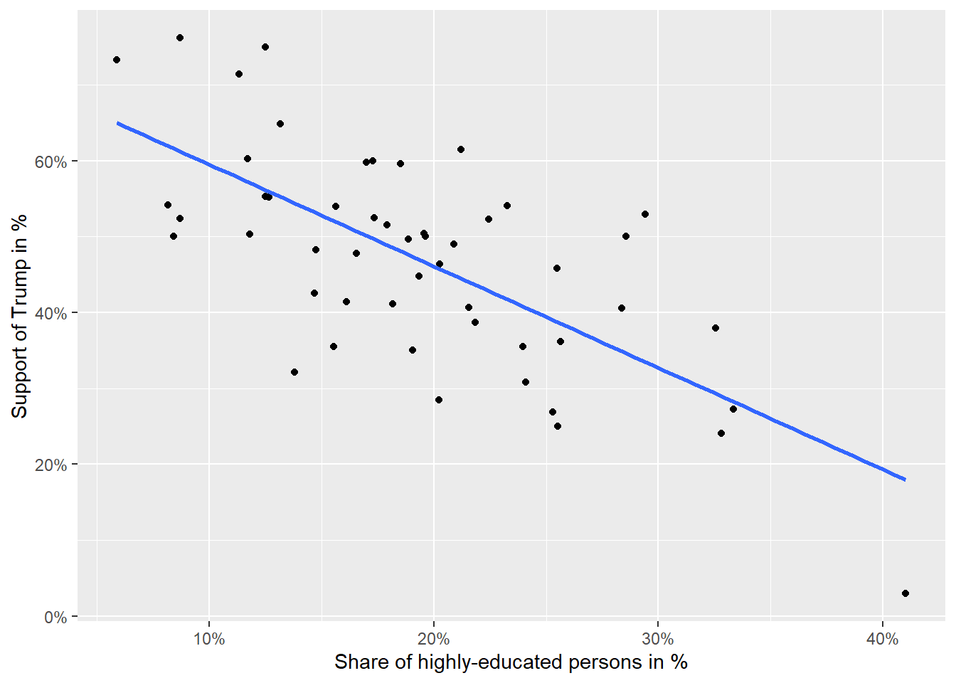 In the next step, the correlation between the share of highly educated people and the share of Trump supporters is calculated and a line representing their relationship is plotted. The line essentially depicts the bivariate association in the form of a regression slope, which always runs in the direction of the correlation. However, its interpretation differs from correlation.