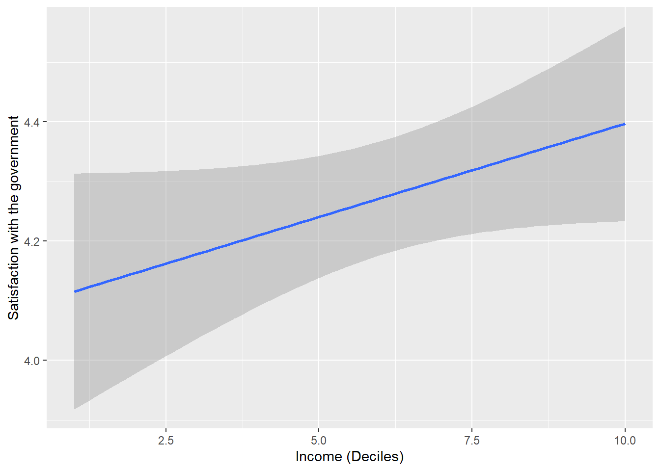 \(H_0\): High-income individuals are equally or less satisfied with government than low-income individuals (i.e., null or negative relationship between income and satisfaction with government).