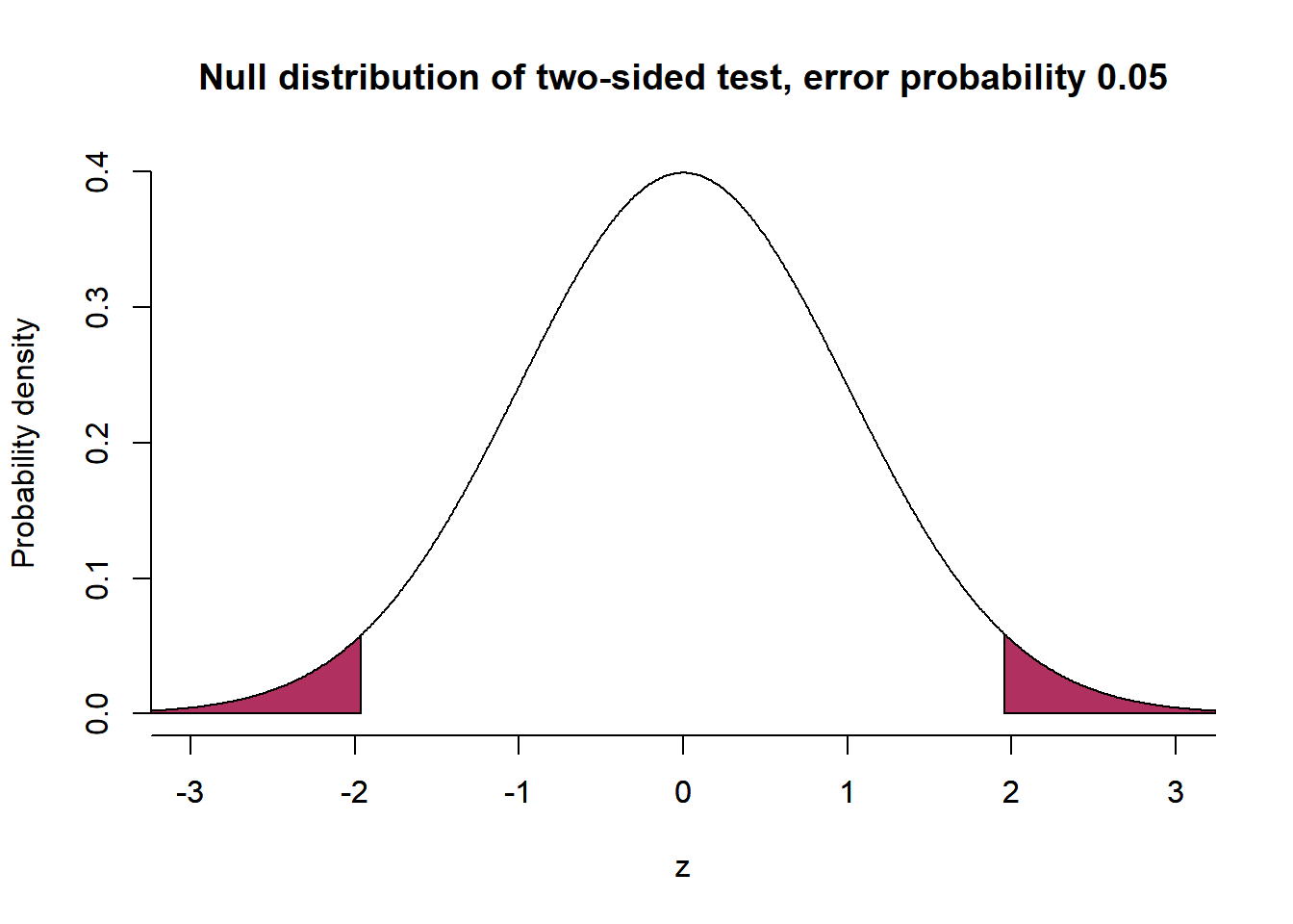 plot( x=z, y=dnorm(z), bty='n', type='l', main="Null distribution of two-sided test, error probability 0.05", ylab="Probability density", xlab="z", xlim=c(-3,3))