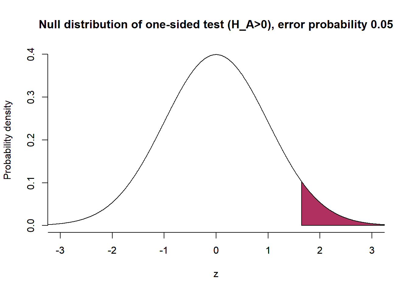 plot( x=z, y=dnorm(z), bty='n', type='l', main="Null distribution of one-sided test (H_A>0), error probability 0.05", ylab="Probability density", xlab="z", xlim=c(-3,3))