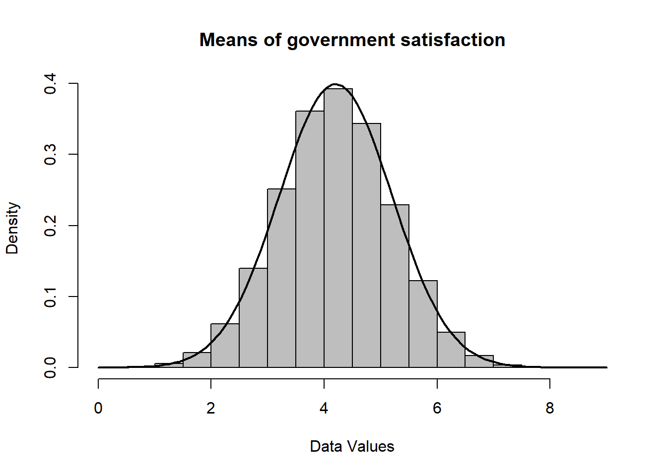 hist(data, freq = FALSE, col = "gray", xlab = "Data Values", main = "Means of government satisfaction")